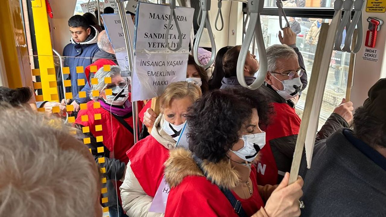 DEV DİSK Emekli Sen Üyeleri ağızları bantlı maskelerle Büyükşehir Belediye tramvay durağı önünde bir araya geldi. Atıkları sloganlarla içinde bulundukları ekonomik sıkıntıları tramvayda yolculuk yapan vatandaşlara anlatmaya çalıştı. Büyükşehir Belediyesi önünden tramvaya binen emekliler, şehir hastanesi kadar tramvayla yolculuk yaparken sorunları dile getirmeye çalıştı.